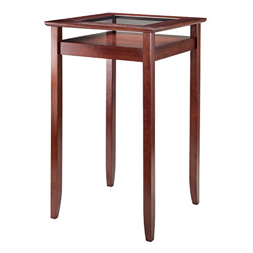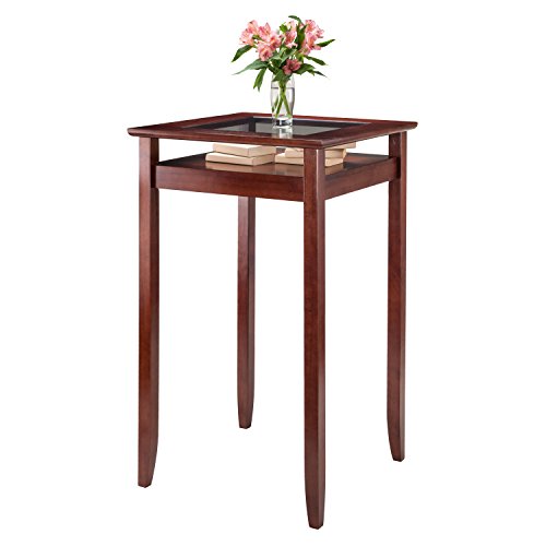 -. Feature : Dimensions: 25.59L x 25.9W x 42.13H in. / Engineered wood and metal construction / Solid wood with inlaid glass top / Walnut finish / Square tabletop and open shelf
