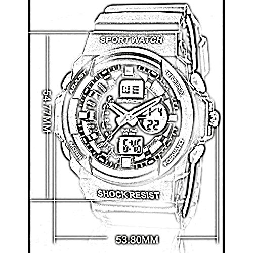 Specifications: Case material: ABS Resin Back material: Stainless steel Band material: Silicone Wrist perimeter: 14-24cm (5.5-9.5inches) Display Type: Analog and Digital Movement?: Japanese quartz and electronic Water resistant: 50m(165 Feet) Color: As pictures shown