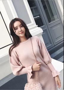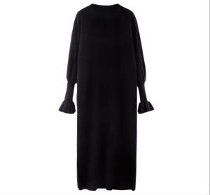 ニットワンピース 膝丈 ラウンドネック パフスリーブ 長袖 大人ワンピース 秋冬 春 リブニット 膝下 セーター