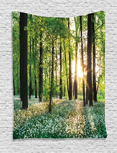 Ambesonne Farm House Decor Collection, Sunny Forest with Wild Garlic Enchanting Wildflowers Blossoms Landscape Scene, Bedroom Living Room Dorm Wall Hanging Tapestry, Green White