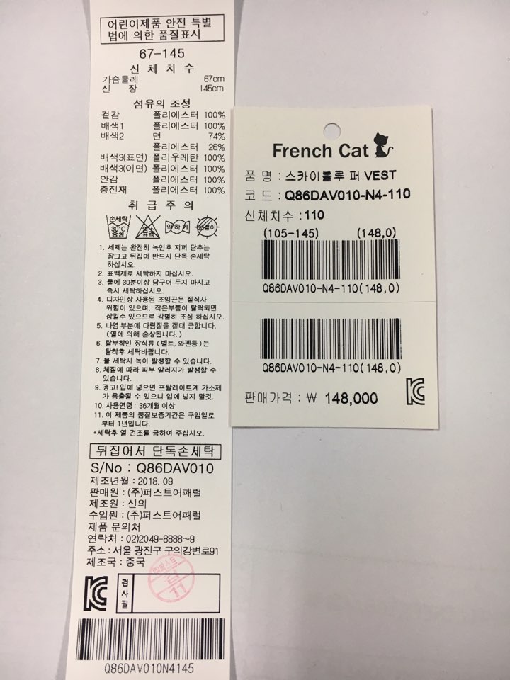 제품소재 : 겉감. 배색1: 폴리에스터100%배색2: 면74% 포리에스터26%배색3(표면): 폴리우레탄100%배색3(이면): 폴리에스터100%안감.충전재: 폴리에스터100%