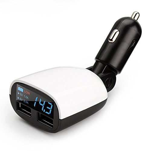 -. Feature : 2-Ports USB charger, 2.4A+1A can charge for two different devices at the same time, fast charging / 180 swing design, convenient to adjust the best location / The outside shell is made of ABS fireproof material, not deformed,featuring high strength, anti-shock, bumps resistance, etc / Built-in intelligent management chip, effectively prevent overchage and short circuit, security,Crafted with fire-retardant materials and smart chips to offer over-current & over-charging protection / Concise LCD screen to display charging status, vehicle battery voltage; considerate low voltage alarm,Concise LCD screen to display charging status, vehicle battery voltage; considerate low voltage alarm