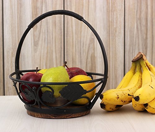 HANDMADE FRUIT BASKET WITH HANDLE WOOD IRON TABLETOP VEGETABLE ORGANIZER