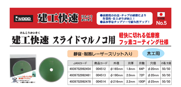 【商品名】(業務用3個セット) 建工快速 スライド丸のこ用チップソー/先端工具 【木工用】 フッ素コーティング仕様 刃数:72P 日本製 190×2.0×