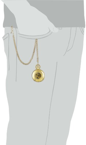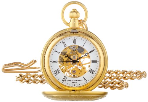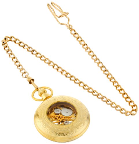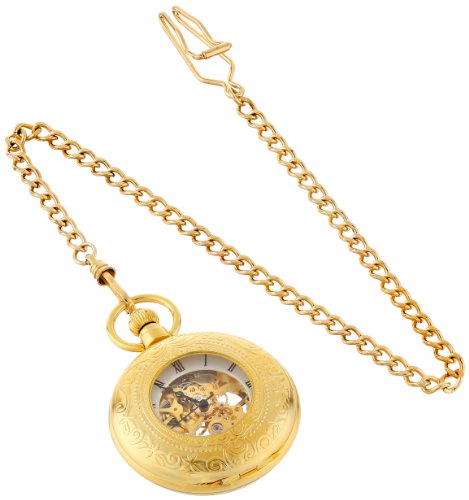 -. Feature : 14k gold-plated brass 47mm demy hunter case with a matching curb chain / Skeleton dial with roman numerals / 17 jewel mechanical movement / Deluxe gift box