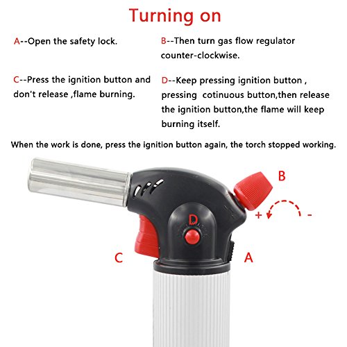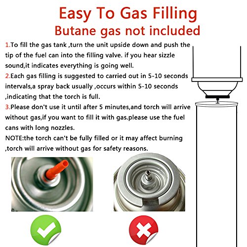 - EASY TO FILL AND USE---- Quickly refill butane torch with any brand of butane.Please ensure Gas Flow Regulator dial of culinary torch is closed/locked when filling with butane.Safety On/Off switch for when torch is not in use. Use this torch at any angle even upside down with effortless one hand operation.