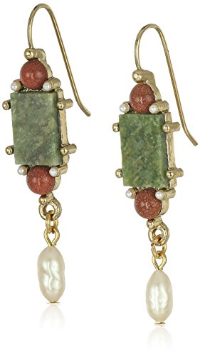 Gold-tone drop earrings featuring rectangle-shape jade semi-precious stones and round-shape goldstone semi-precious stones with oval-shape simulated pearl beads