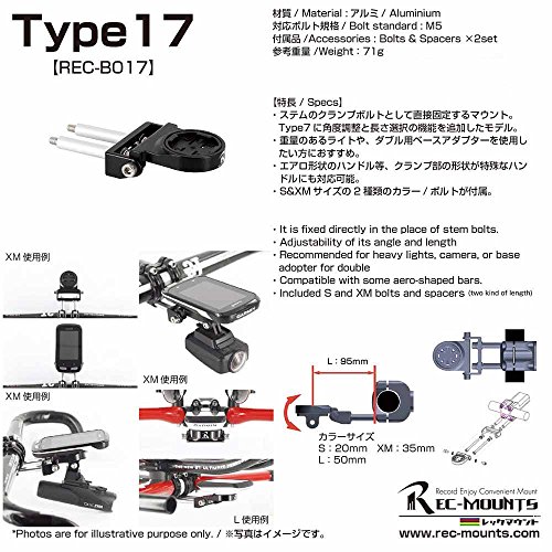 -. Feature : バリエーション毎の商品仕様・説明文をご覧ください。このマウントに装着出来る機種 www.rec-mounts.com / アウトフロントバイクマウント Type17 ステムボルトタイプ / 4本ボルトがあるステムの 上下どちらか2本を外して取付るマウントです。ヘッド部分が動くので角度調整も可能. エアロハンドルや35mmのハンドル・幅の広いステム・DHバー(TT・エアローバー)向け最少約10mm?最大35mmまで対応(ボルト中心) / 対応ボルト規格:M5専用  推奨積載 上部:~160g  下部:~350g  ベース材質アルミ S & XMボルトセットが付属 / 適合機種(Compatible models) eTrex? 10 / eTrex10J / eTrex? 20 / eTrex20J / eTrex? 30 / eTrex30J / eTrex? 20x / eTrex? 20xJ / eTrex? 30x / eTrex? 30xJ / eTrex? Touch 25 / eTrex? Touch 35 / eTrex? Touch 35t Garmin Edge20/25/200/500/510/520/810/1000など+GoPro・シマノスポーツカメラなど 又はライトアダプター 例 GP-CATHL2など