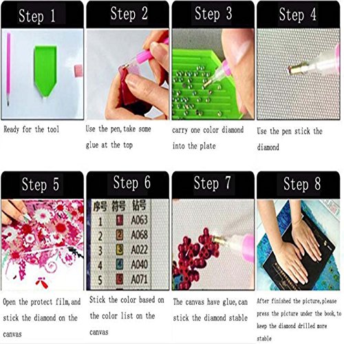 DIY Diamond painting production steps 1. Open the package and check the diamond draw special tools. 2. View the resin diamond color,arranged in order of coding. 3. Uncover tape drawing above, you will see a lot of symbols corresponding to the color coding. 4. According to the corresponding color coded clamp the corresponding the resin inlaid diamonds. 5. Suggested that one type of the resin diamond one set completed faster. 6. In order to create a perfect diamond painting,drawings put together in one place every row symbols do not have to stay stuck diamonds. 7. To cut a good figure on the drawings hold sorted array mounted to the plane of the material above. 8. Splices need flat against the neat,do not have cracks. 9. After a good fight,the rest of the gap at the glue corresponding symbols of diamonds. 10. To complete a good diamond drawing,put it in your selection of a suitable framework (This product is not provide a framework).