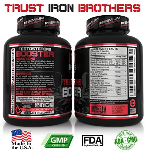Iron Brothers Supplements Testosterone Booster Helps naturally increase energy levels, boost your strength and raise your libido. Its unfortunate that the older we get the more our test levels decrease and continue to ?decrease. Which in turn reduces strength, stamina, energy levels and even our sex drive. All major keys to living a healthy, happy lifestyle.? Iron Brothers Test Booster is formulated by real lifters for real lifters or your average guy looking to put that extra spring in his step. Believe us, we know all to well the joys of aging. Help turn back the hands of time by supplementing with a test booster that will raise your energy levels, help you get those extra reps in the gym and raise the temperature in the bedroom.? Paired with a healthy diet and workout routine you can start targeting those unwanted fatty areas of your body.? Our Test Booster will help you restore long lost energy, give you extra stamina for everyday living and even help build your strength back in the gym helping you push more reps, for more sets, for maximum gains!? More importantly, it can help build back some of your lost confidence you need for all aspects of your life. You wont find proprietary blends in any of our products as we believe in full label transparency. Too many supplement company's are still hiding behind the good old "proprietary blend". Look closely and you will see 11 ingredients proven to increase testosterone in aging males, not to mention 5 mg of Bioperine to help with nutrient delivery and increased absorption, We also use OrganiFlow™ to eliminate the artificial excipients: There is no more need for these potentially harmful artificial ingredients. Artificial excipients act as a filler in capsules.? Trust Iron Brothers Supplements? Don't suffer with low testosterone. There is help available! Grab a bottle of our natural Test Booster Today 0