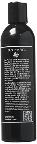 Aloe - reduces inflammation and promote skin repair.Vitamins C and B - these vitamins penetrate deep into the skinto improve skin elasticity promote collagen production and diminish dark spots.Panthenol B5 - penetrates into deeper layers of the skin adding essential moisture.Organic Cocoa Butter - Our Cocoa Butter has incredibly high content of vitamin E to help with skin renewal and repair. Antioxidants protect the skin from free radicals or toxins that damage tissues at the cellular levels.Sodium Hyaluronate - promotes microcirculation, nutrient absorbtion, and provide super-sized hydrating properties. It also can reduce appearance of dark sun spots and other imperfections.Stay Tan, Stay Flawless.Tan Physics Ultra-Hydrating Tan Extenderis your key to an enduring youthful glow.Feature
