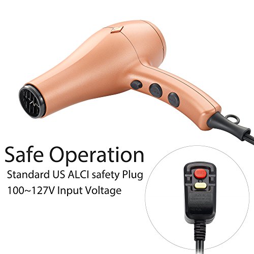 - Powerful 1875 Watt(DC Motor) produce strong air flow to dry hair with low noise.Double protection circuit design.Standard US ALCI safety Plug.100~127V USA Voltage input.
