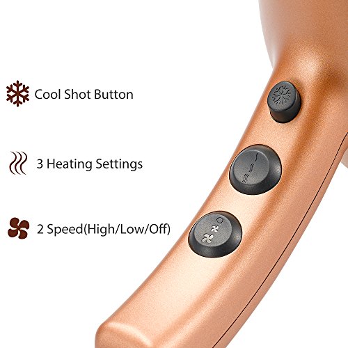 - 3 heat settings(low/medium/high),2 speed setting(low/high).Cool shot button(Cool/Warm blow switchable).Making more easy to control the temperature and wind speed to make your favorite hairstyle at home.