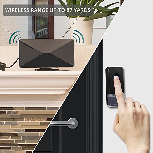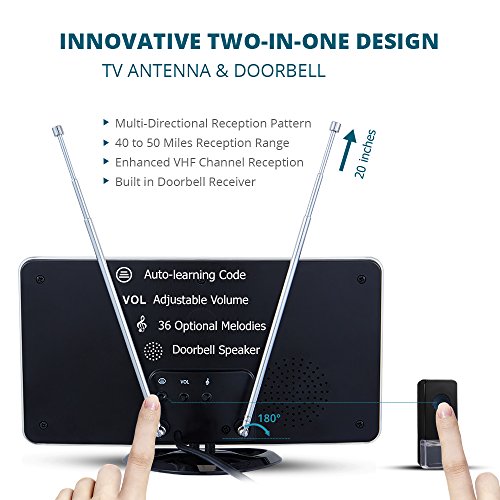 ◆The ANTOP AT-216BDwith innovative TWO-IN-ONE design,combines the function ofan antenna with awireless doorbell. This allows you towatch your favorite over-the-air TV shows and when someone pushes the doorbell button it rings.It is easy to set up the doorbell with auto-learning codes, adjustable volumecontrol, 36 different melodiesoptions, and a wireless range of up to 87 yards.1 Receiver can pair up to 5 doorbell buttons.Consumer package includes 1 button only.