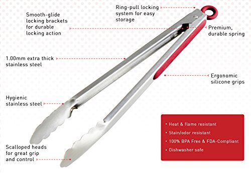 - QUALITY CRAFTSMANSHIP, BUILT TO LAST: These tongs are made with extra thick 1.00mm stainless steel from the handles all the way to the scalloped steel heads - they simply won't melt, warp, rust or flake into your food like cheaper tongs. And the ring-pull locking system on these tongs has special brackets to ensure a smooth, durable action that will last years.