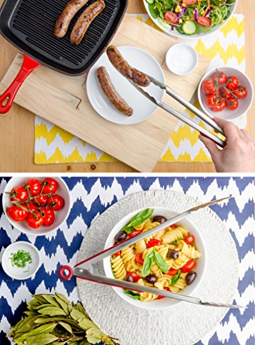 - TOUGH STAINLESS STEEL GRILL AND KITCHEN TONGS: These super-tough stainless-steel tongs are a workhorse in the kitchen – great for grilling corn, flipping burgers, serving salad, cutting roast meat, and much more!. LARGE TONGS: 12” long