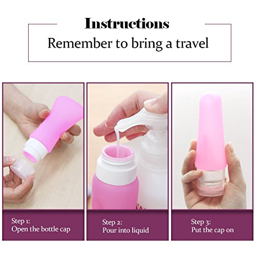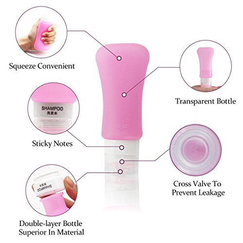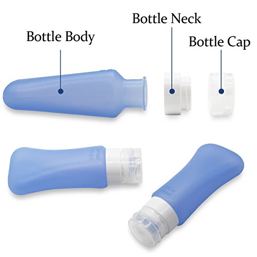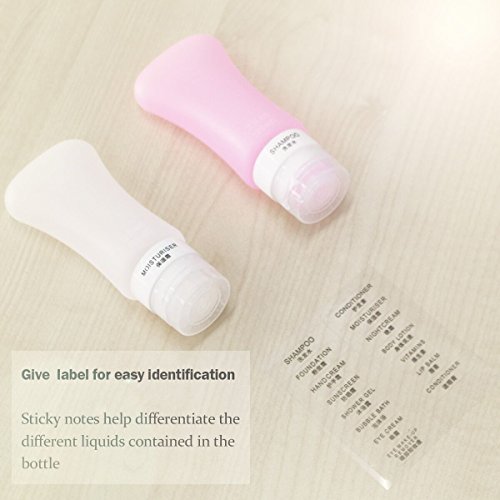 - 🌺 DESIGN: Silicone Travel Bottles cap leak-proof design, good sealing effect, the use of split design, from the bottle, bottle cap, bottleneck composed of three parts. Enclosed 2 stickers, labels in the neck of the cap to show the contents filled in the travel bottles.