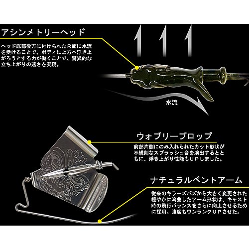 GAN CRAFT/건 크래프트KILLERS BUZZ BURST/킬러의 버즈베이트(Buzzbait) 버스트◆Weight:1/2oz(14g)헤드 형상은 토탈 밸런스를 UP하기위해 건 크래프트가 개발하도록 한 다음에 하비대칭 형상 하이 포텐셜(potential) 헤드.헤드 상부는 스커트를 감아 올리기 쉬운 형상으로 있기 때문에,캐스트시에 스커트가 프로펠라에 휘감기고, 프로펠라를 잠거 비행 자세를 안정시켜 비거리를 UP 하게 합니다.헤드저 부후방에는 하을 위한의 R을 붙여 수류를 받기 쉬어 하고 있기 때문에 떠올라 성능도 좋고, 장애물 회피 능력으로도 뛰어나 있습니다. 장애물 터치 직후에는《히라》을 치기,민첩하게 안정 자세를 확보하고, hooking율을 UP 하게 합니다.버즈베이트(Buzzbait)의 프로펠라에는 알루미늄 소재를 사용하고, 매혹 물보라라고 파동으로 빅 버스에 어필합니다.