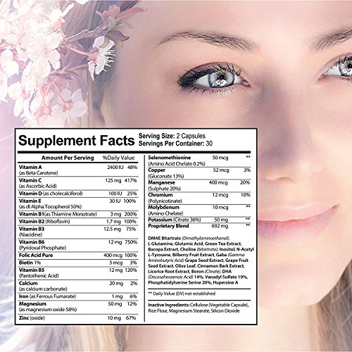 This nootropic contains a Synergistic and Proprietary formulation that includes Dimethylaminoethanol or DMAE, L-Glutamine, L-pyroglutamic Acid, Phosphatidylserine, DHA, Choline, Inositol, N-acetyl tyrosine, Gamma-Amino Butyric Acid or GABA, Vinpocetine, Trace lyte electrolyte concentrate, Vanadyl sulfate, Activin, Grape seed extract, Bilberry fruit, Huperzine A, Boron and Bacopa monnieri leaf extract or Bacopin, these nutrients all work together for the overall health of the mind and body