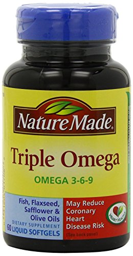 Studio : Nature Made Publisher : Nature Made Binding : Health and Beauty Product Description Dietary Supplement. Omega 3-6-9. Fish, flaxseed, safflower olive oils. Formulated for easy absorption. May reduce coronary heart disease risk. Heart healthy. May reduce the risk of coronary heart disease. Consumption of omega-3 fatty acids may reduce the risk of coronary heart disease. FDA evaluated the data and determines that although there is scientific evidence supporting the claim, the evidence is not conclusive. Omega-3 fatty acids also help maintain triglyceride levels. No artificial colors. No artificial flavors. No preservatives. No yeast, starch or gluten. Triple omega softgels are made to Nature Made's guaranteed purity and potency standards. (These statements have not been evaluated by the Food and Drug Administration. This product is not intended to diagnose, treat, cure or prevent any disease.) 0