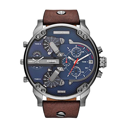 -. Feature : Herren Uhr - Graues rundes Edelstahlgehäuse (Durchmesser 66 mm) in glänzend und gebürstet - 4 Kronen und 2 Drücker - Wasserdicht bis 3 ATM / Braunes Lederarmband mit grauen Schrauben - Dornschließe / Strukturiertes blaues Zifferblatt mit blauen Indexen - Chronograph mit Datum und 24-Stunden-Anzeige, 2-Zeiger-Werk und 2 Werke mit Drehscheibe - Silberne Zeiger mit rotem Sekundenzeiger - Mineralglas / Verpackt in einer Geschenkbox