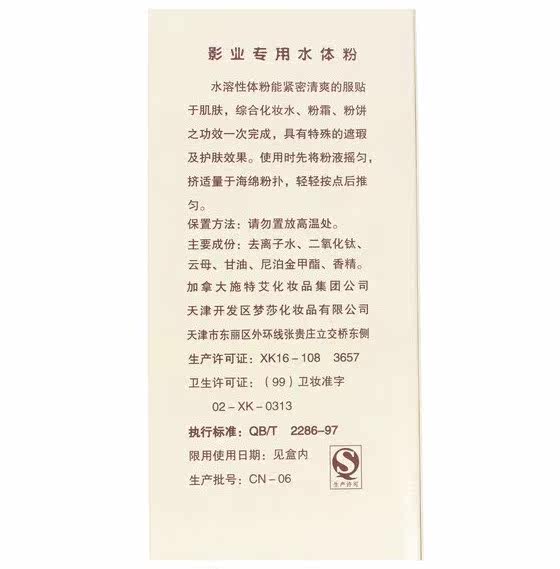 功 能:水容性体粉具有具有良好的遮瑕及护肤功效