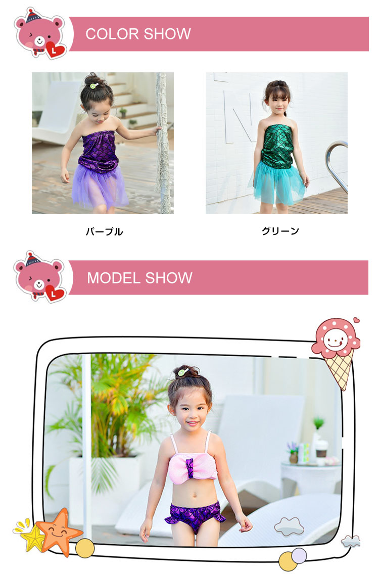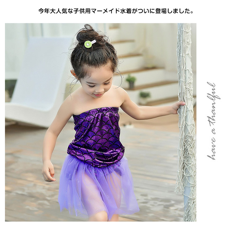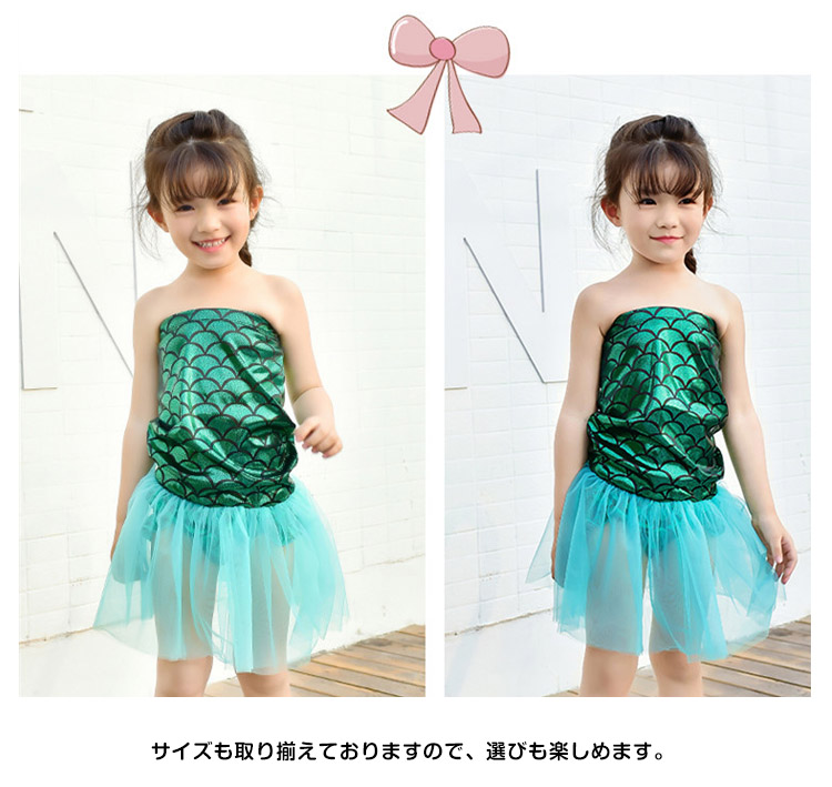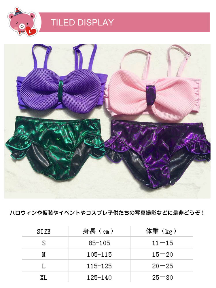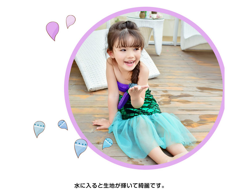 | 今年大人気な子供用マーメイド水着がついに登場しました。アリエルに憧れているガールズにおすすめなitem。水に入ると生地が輝いて綺麗です。サイズも取り揃えておりますので、選びも楽しめます。ハロウィンや仮装やイベントやコスプレ子供たちの写真撮影などに是非どうぞ! | |