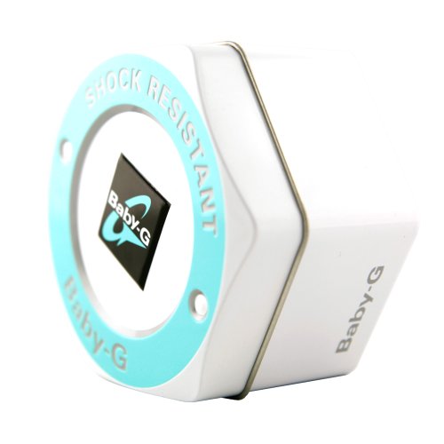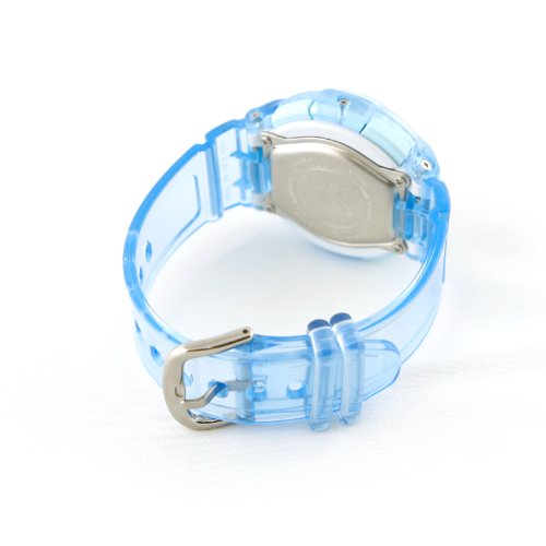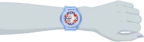 Semi-transparent blue resin case and strap. Fixed blue resin bezel. Grey dial with blue hands and multi-colored Arabic numeral hour markers. Dial Type: Analog-digital. Quartz movement. Scratch resistant mineral crystal. Solid case back. Case diameter: 43 mm. Case thickness: 15 mm. Round case shape. Band width: 26 mm. Tang clasp. Water resistant at 100 meters / 330 feet. Casual watch style. Casio Baby-G Marine Resort Clear Blue Digital Ladies Watch BGA131-2BCR.Feature