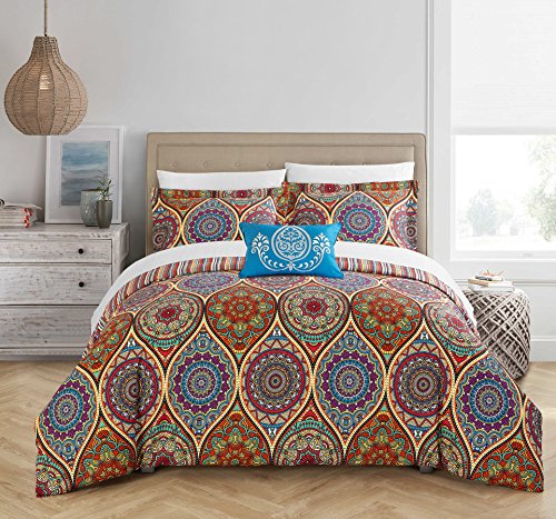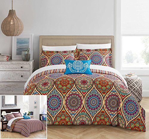 A globally inspired Bohemian bedding collection with everything you need for that perfect chic Boho look. Bright and fun colors in red, tangerine and blue tones make this large-scale paisley and striped pattern set the perfect choice for your bedroom decor. Design coordinated reversible shams and a trendy embroidered deco pillow are included to complete the look. Zipper closure for easy washing.