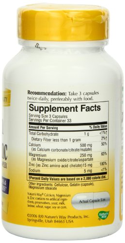 -. Binding : Health and Beauty -. Brand : Nature's Way -. Label : NATURE'S WAY -. Manufacturer : NATURE'S WAY -. PackageQuantity : 1 -. ProductGroup : Health and Beauty -. ProductTypeName : HEALTH_PERSONAL_CARE -. Publisher : NATURE'S WAY -. Studio : NATURE'S WAY -. Title : Nature's Way Calcium Magnesium & Zinc