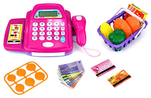 -. Feature : Fun Store Educational Pretend Play Battery Operated Toy Cash Register / Working Scanning Action, Scanner Beeps When Button is Pressed / Comes w/ Groceries Goods, Mock Money and Credit Card, Shopping Basket / Working Calculator, Use the Built In Screen to Calculate P.R.Ices / Requires 2 AA Batteries to run (not included)