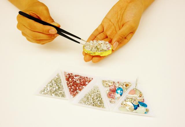 ピンセットや接着剤など、クリスタルデコを始めるために必要な道具がセットになっているので、