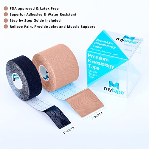 Kinesiology Tape Pro, Muscle Support Adhesive, Physio Therapeutic Recovery Sports Athletic Aid, Mytape, 2 Uncut Rolls (2"W x 16.4'L / 1"W x 16.4'L, Beige / Black)