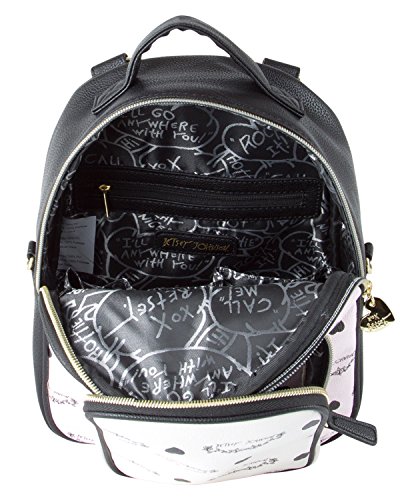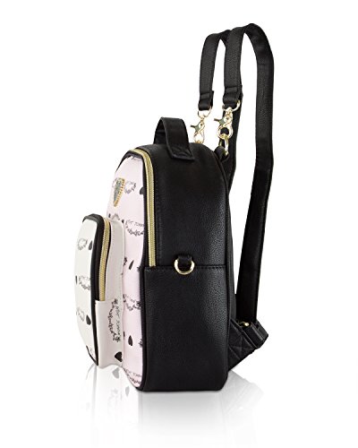 Switch up your look with Betsey Johnson Mini convertible Backpack, Featuring allover printed faux leather, Zipper pocket accented with logo On the front. This Betsey bag converts from backpack to crossbody for two cute looks in one.