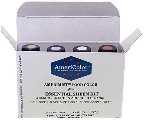 This Kit Includes 4 Air Brush .65oz Sheen Colors: Gold Sheen, Silver Sheen, Pearl Sheen, Copper Sheen