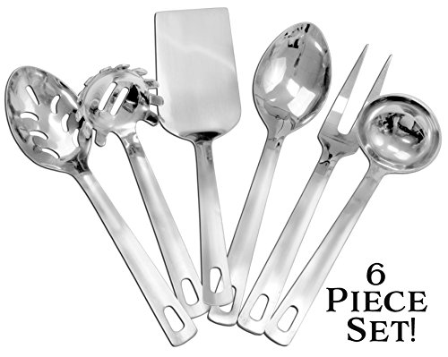 Deluxe Serving Spoon & Utensil Set (6-Piece Set); Includes Pasta Server, Fork, Spoon, Slotted Spoon, Ladle, & Cake / Casserole Server; Stainless Steel Classic Plain Handle Flatware