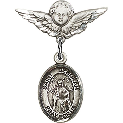 -. Title : Sterling Silver Baby Badge with St. Deborah Charm and Angel w/Wings Badge Pin 7/8 X 3/4 inches