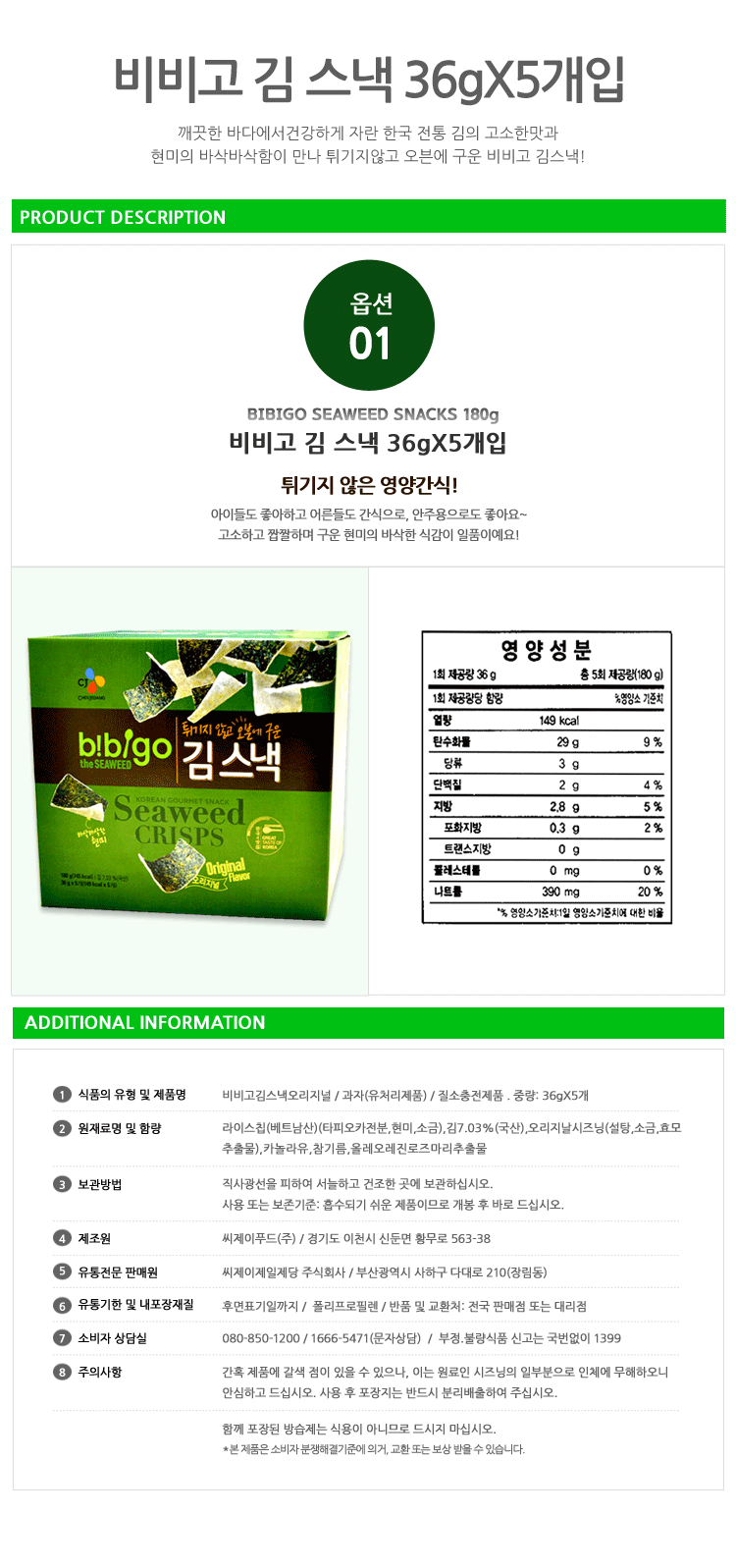 CJ BIBIGO Seaweed Snack Original 36g x 5pieces Kim Snack