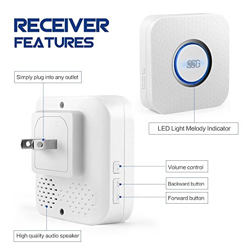 SSG wireless doorbell is an ideal unit for easily installing a doorbell without the hassle of wiring. Simply plug the receiver to an AC outlet and mount the transmitter where needed and you are ready to go!