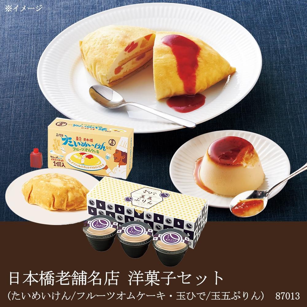 | 日本橋で古くから愛され続ける「玉ひで」と「たいめいけん」の洋菓子セットです。玉ひで八代目当主監修の玉五ぷりんは、とろけるような舌ざわりとコク深い味わいが特長のこだわりの品。三代目たいめいけん監修のフルーツオムケーキはお店の看板メニューのオムライスをイメージし、クレープ生地でフルーツとクリームを包み込みました。 |