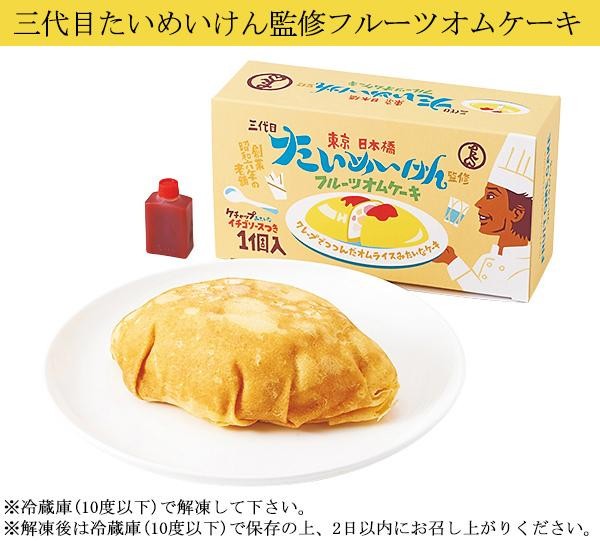 | セット内容 | 三代目たいめいけん監修フルーツオムケーキ(ケーキ×1個・ソース12g×1個) 玉ひで八代目山田耕之亮監修玉五ぷりん(90g)×3個) |
