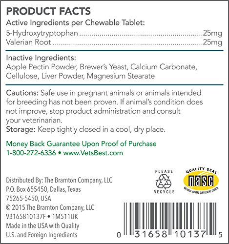 Vet's Best calming tablets are made with quality natural ingredients (Tryptophan and Valerian Root) to help calm and relax your dog. Our product is veterinarian formulated for best digestion and absorption. Also, our dog supplement tablets are made in the USA with quality US and globally sourced ingredients. Vet's Best dog supplements have the National Animal Supplement Council (NASC) Seal of Approval.