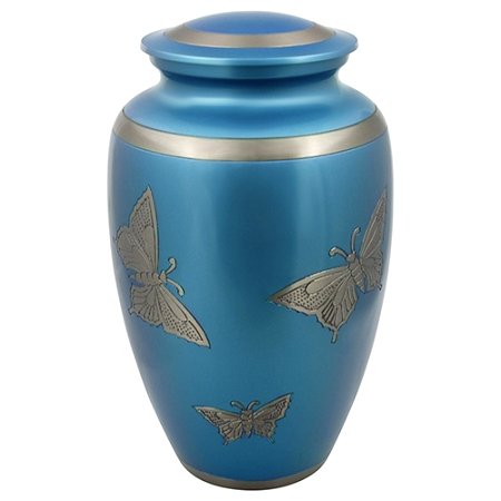 Silverlight Urns Classic Engraved Butterfly urn in Blue, Brass Adult Size Cremation Urn for Ashes, 10.25 Inches Tall