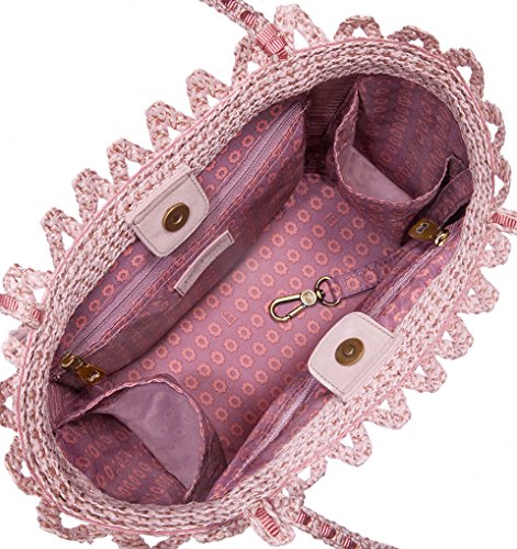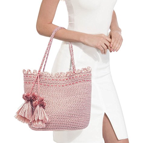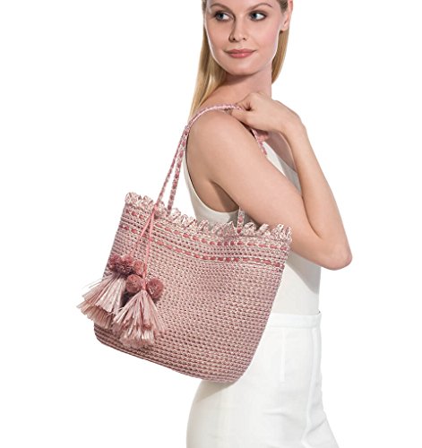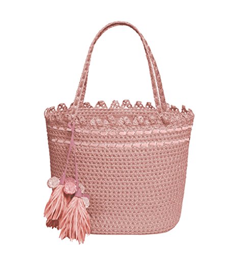 Medium size tote of vented Squishee® has magnetic snap closure, bottom feet, self-picot trim and pom-pom tassel ornament. Inside: Dual sidewall zipper compartments, two patch pockets and key clip holder will keep your essentials organized