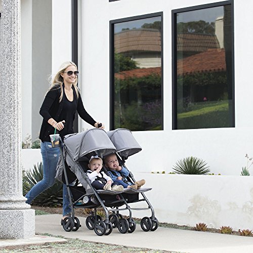 The Joovy Twin Groove Ultralight Umbrella Stroller is ready for twins or a second child. With independent reclining seats and a bassinet mode to accommodate newborns, each seat can hold a child up to 50 lbs. The Twin Groove Ultralight features a soft brushed fabric that is water resistant and UPF 50 canopies for sun protection. It is easy to maneuver and fits through standard doorways. A 6-wheel suspension and adjustable footrest makes the ride more comfortable. Four in-seat mesh pockets keep bottles, sippy cups, snacks or toys within reach. While the peek-a-boo windows allow you to keep an eye on babies at all times. Feel like going out for an after dinner stroll? The Twin Groove Ultralight has safety reflectors that will illuminate at night. Three cup holders and two zippered pockets for your keys, phone and valuables are included. When not in use, the Twin Groove Ultralight folds down easily. It is great for travel weighing less than 26 lbs and includes a carry strap that fits comfortably on your shoulder.Feature