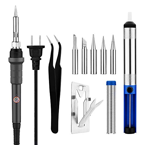 Homteck Full Set 60W 110V Soldering Iron Kit - Adjustable Temperature, 5pcs Different Tips, Desoldering Pump, Stand, anti-static Tweezers