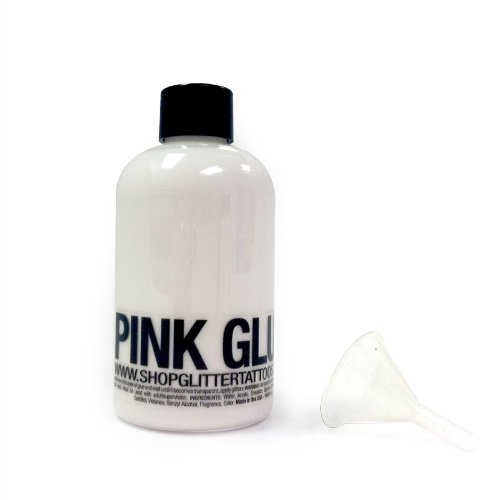 LASTS 3-10 DAYS ON THE SKIN One bottle of 4.4 fl oz Pink body glue refill (without applicator). This bottle can produce about 1000-1100 tattoos. keep sealed tight and in room temp. Product may separate if freezes Shipped with a small funnel for easy glue transfer to applicators.Feature