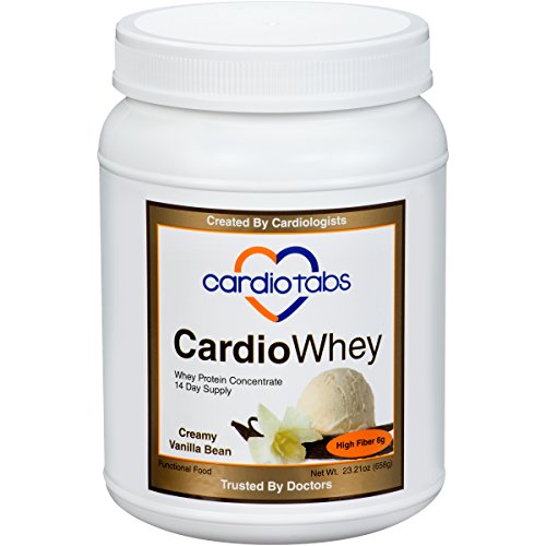 -. Binding : Health and Beauty -. Brand : CardioTabs -. Color : Vanilla -. EAN : 0183076000225 -. Feature : Preventive Cardiologist and Registered Dietitian Developed / 21 grams protein to support muscle health / High fiber - 6 grams / Gluten free / Promotes digestibility -. IsAdultProduct : 0 -. Label : CardioTabs -. LegalDisclaimer : Actual product packaging and materials may contain more and different information than what is shown on our website. We recommend that you do not rely solely on the information presented and that you always read labels, warnings, and directions before using or consuming a product. -. Manufacturer : CardioTabs -. MPN : 0713VN -. PackageQuantity : 6 -. PartNumber : 0713VN -. ProductGroup : Health and Beauty -. ProductTypeName : HEALTH_PERSONAL_CARE -. Publisher : CardioTabs -. Studio : CardioTabs -. Title : CardioWhey Creamy Vanilla Bean, Concentrate, 21 grams of Protein and 6 grams of Fiber per Serving -. UPC : 183076000225