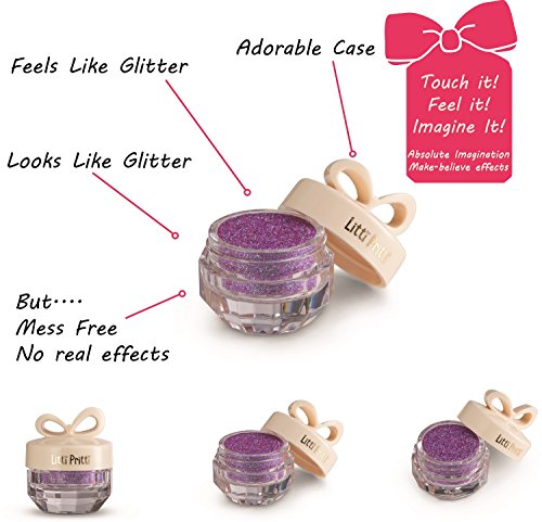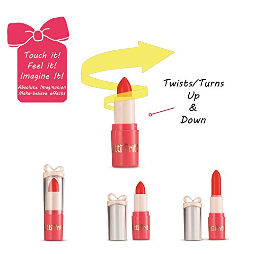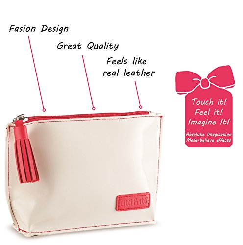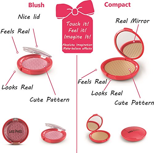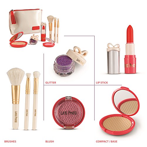 Pretend Makeup Set for Hours of Role-Playing Fun. Let you daughter pretend she's putting on her own makeup with the Litti Pritti 8-Piece Pretend Makeup Set. As she stands proudly beside you, she can imitate you by putting on some make-believe, rubber makeup, including blush, lipstick, and face powder. There's even pretend glitter for those extra special occasions when she wants to go all out. The lipstick tube goes up and down to emulate the real thing. The set also includes three brushes?and a real cosmetic bag to enhance her role-playing fun. The brushes are made using animal hair for soft comfort against her skin, while the cosmetic bag is?made from PU leather to furnish real style and quality. Then when she's done playing, this cosmetic bag also provides a convenient place for her to store all of her makeup. What You Get - compact case with mirror