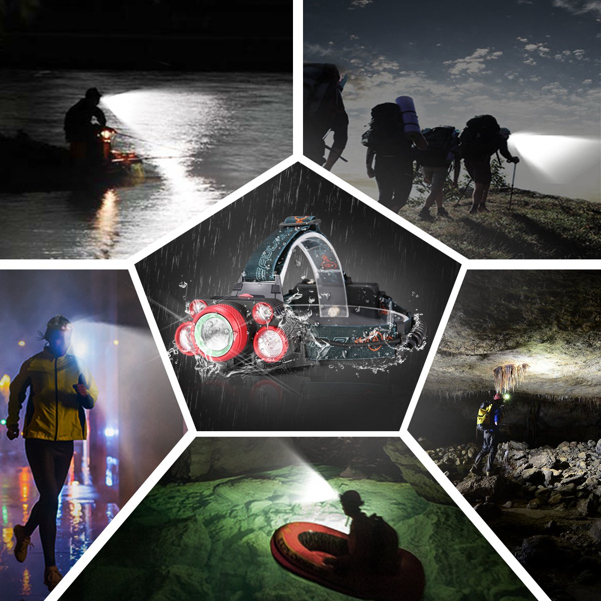 Lighting mode: 1 center light (T6) - 4 * XPE light - T 6 + 4 * XPE light - 5 light flashing